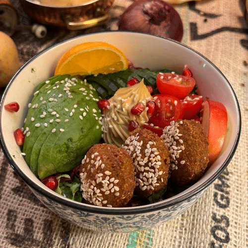 mit 4 Falafelbällchen, Avocado und Salat, dazu Brot